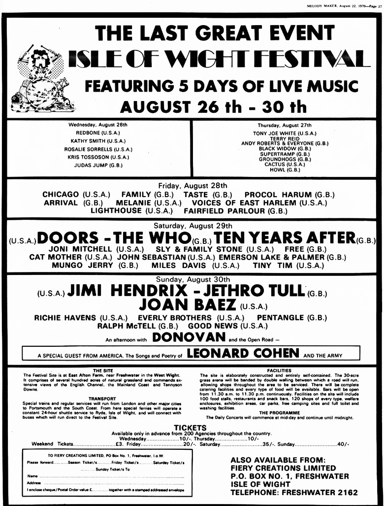 After this recording, in 1969, Elektra called Bromberg for a session on Tom Paxton’s album The Things I Notice Now. After more studio and live gigs with Paxton, Bromberg recorded with Tom Rush and Richie Havens. Then, Bromberg was invited to accompany folk singer-songwriter Rosalie Sorrels for the opening night of the now legendary 1970 Isle of Wight Festival, which boasted Jimi Hendrix, the Doors, The Who, and Miles Davis. Here’s the entire lineup: