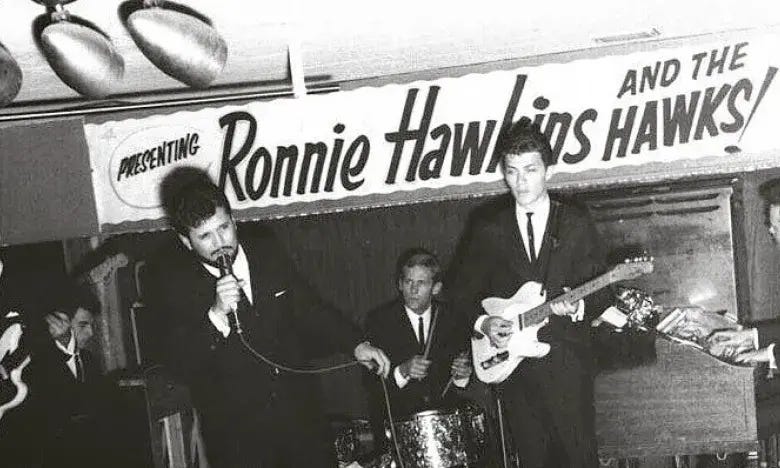 It was in nearby West Helena that Helm met another Arkansas native, Ronnie Hawkins, who was playing a show without a drummer. His piano player knew Helm and suggested that he join the band that evening on drums. It was Helm’s “big break.” While Helm was still in high school, Hawkins invited him to join his band, The Hawks. Here’s an early picture of Ronnie Hawkins and The Hawks, with Helm on drums: