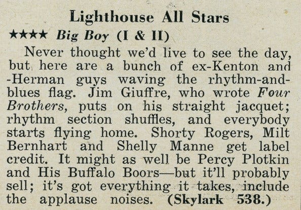 Here’s a review of the record in the July 30, 1952 issue of Down Beat magazine: