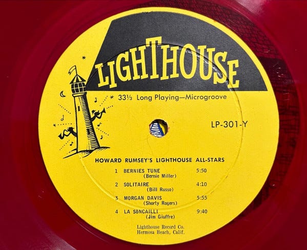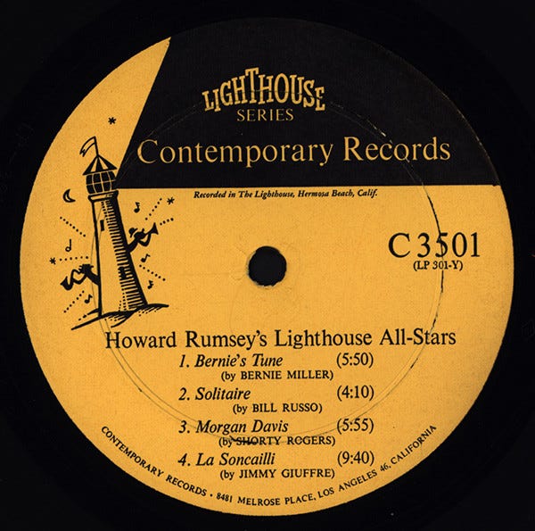 Here is Rumsey’s Lighthouse Records album Sunday Jazz A La Lighthouse Vol. 1, released in 1953 as the first Contemporary Records album, essentially the same label issued now under the Contemporary Records’ “Lighthouse Series”: