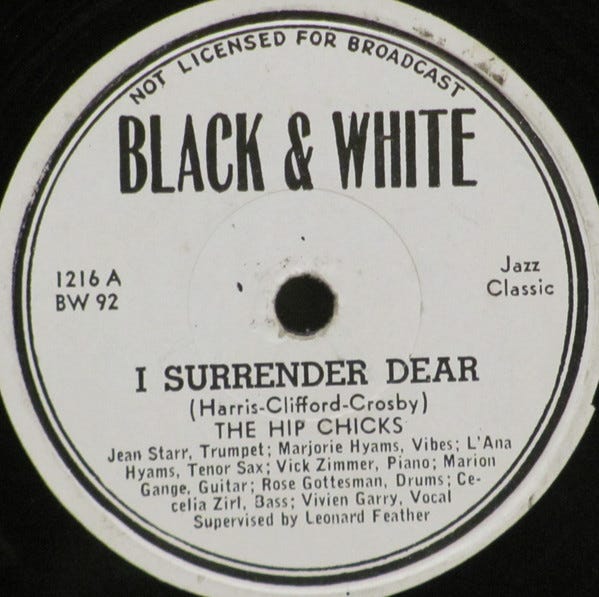 Leonard Feather heard the trio in 1945 during their lengthy engagement at Kelly’s Stable in New York City. He wrote a complimentary review in his regular column in Esquire magazine, and in March of 1945, Feather invited Garry to sing I Surrender Dear on a session for Black & White records with an all-female group, The Hip Chicks, which claimed to be the first all-female jam session in recording history: