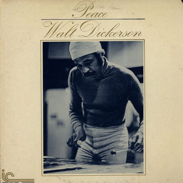 I was too young to drive, so I asked him, “You fly, I buy?” Off we went. While looking through records, I came across two albums, Dewey Redman’s Ear of the Behearer (which we’ll get to next week) and Walt Dickerson’s Peace. I bought them based on the covers alone. When I saw Peace, I thought, "Hey, this guy is playing the vibes!”
